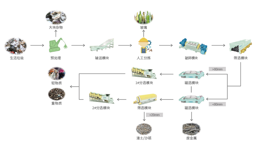 生活垃圾通過資源化處置技術可產出渣土、沙礫、輕物質和廢金屬等。